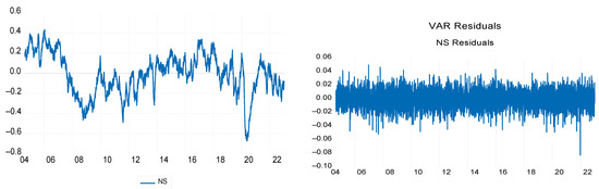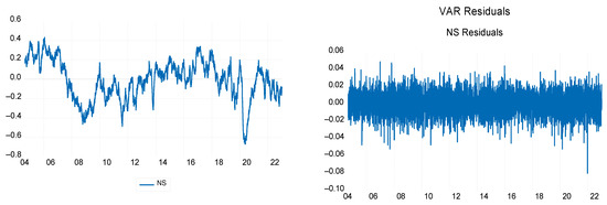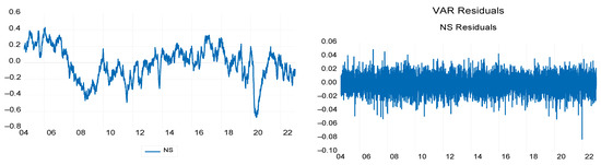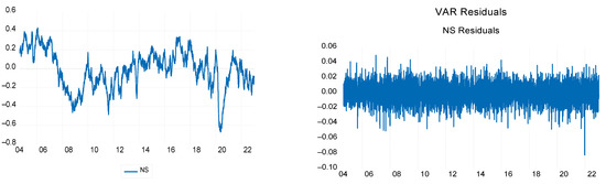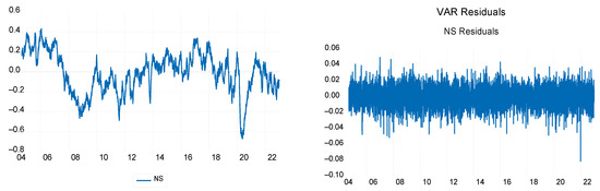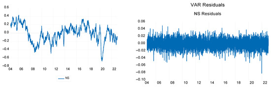 The regression analysis of the seven models taken into account in this study is presented in Table 4, Table 5, Table 6, Table 7, Table 8, Table 9 and Table 10, and the VAR endogenous graph and residuals are in Figure 7, Figure 8, Figure 9, Figure 10, Figure 11, Figure 12 and Figure 13. The test results show that all seven of the models are significant (R-squared and adjusted R-squared = 0.99) both for VAR and Bayesian VAR techniques, being validated also by the F test.