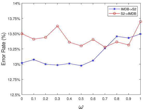 We implement all methods on the PyTorch framework. For feature extractor backbones CapsuleNet and Bi-GRU-A, we fine-tune all word vectors and all attention layers and train the feature extraction layers with a learning rate of and , respectively. We use approximately 2–5 times the learning rate of the feature extractor to train the label classifier, and use 2–10 times the learning rate to train the local discriminator and global discriminator. The update of the important trade-off factor follows the Warm Start principles: . We set as 0, as 1, N as 100. Other hyperparameters are tuned via transfer cross-validation. The source code is available at https://github.com/killer2-1/GLDAL-for-CDSA (accessed on 20 May 2023).