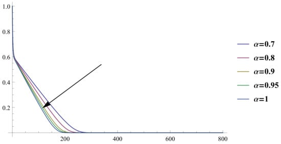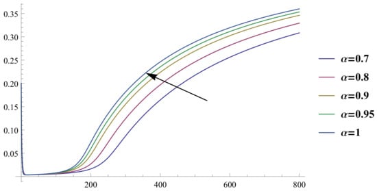 Then, the approximate solutions of and for different values of are given in Figure 12 and Figure 13, respectively. Let us define the maximum error as follows: