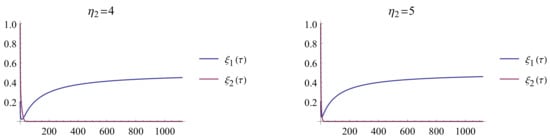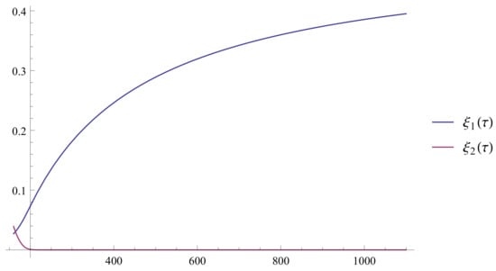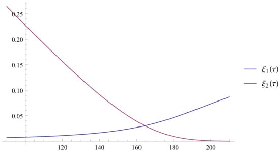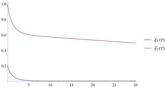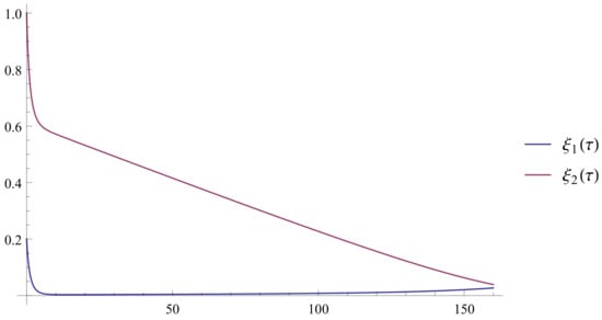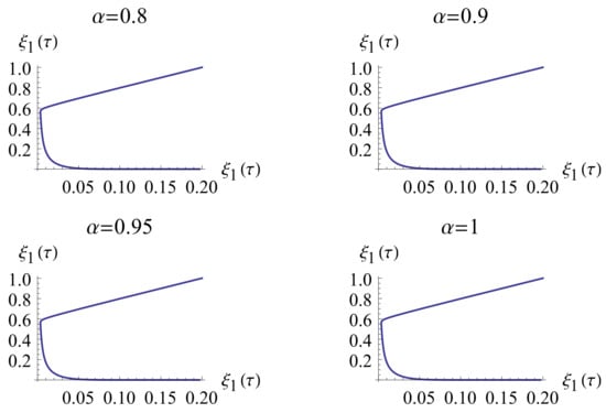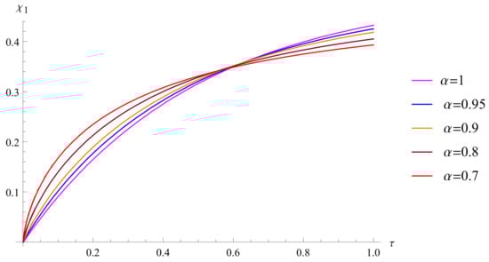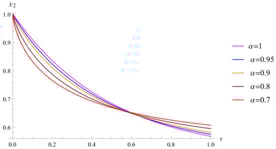 where are positive real constants, , and and are unknown functions with . Another interesting application of Systems (1)–(3) is the set of nonlinear Riccati differential equations (RDEs). RDEs find applications in various fields such as physics, algebraic geometry, and conformal mapping theory, see [9,10]. They also arise in numerous real-world problems. The OMM can be employed to solve systems of RDEs. The OMM facilitates the reduction of nonlinear fractional-order RDEs into an algebraic system. This approach offers advantages such as low setup costs for the equations without the need for projection techniques like Galerkin or collocation methods. It is worth mentioning that we consider a system of equations because the applications we are planning to discuss involve such systems. However, we can generalize this technique to equations. In that case, we obtain a system of algebraic equations. Furthermore, we can also study general nonlinear equations. However, in this case, we end up with a system of equations, and we need to employ numerical methods like Newton’s method to solve this nonlinear system.