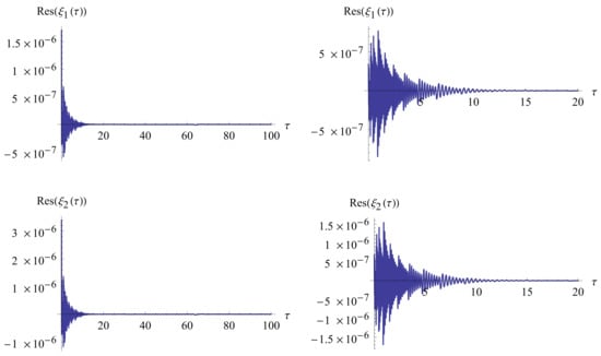 Figure 8 illustrates the residual errors of and for . Since the residual errors are nearly zero, except at the beginning of the interval, we present them over a large interval to demonstrate the error behavior. Additionally, we provide plots of the residual errors over smaller intervals to showcase their magnitudes.