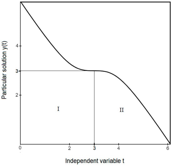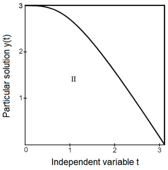 The regularity of change in function (10) is shown in Figure 2. The initial value of y(0) is equal to 3. The final zero value y(t) = 0 is obtained at t = 3.12. In Figure 2, the curvilinear triangle region is denoted by Roman numeral II.