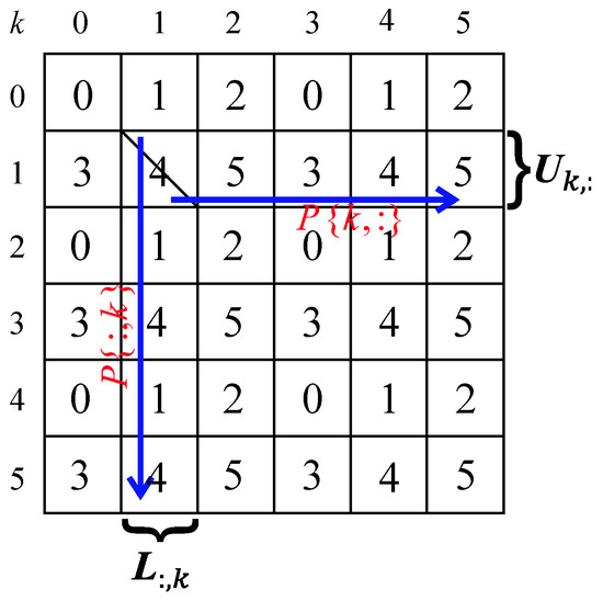 - The first four submatrices and the last four submatrices exchange data including and LU factors again in turn after finishing the LU factorization (①→②→③→④ in Figure 6b,c). The LU factors of are in and the LU factors of are in . are in and are in ;