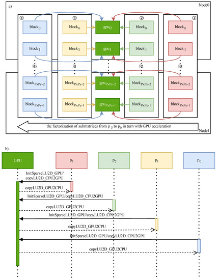 - We factorize , , and with GPU acceleration and synchronize the LU factors from GPU to in turn (②→③→④ in Figure 6b,c). At this moment, are in ;