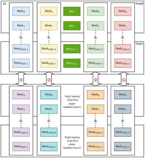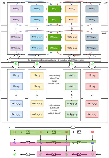 - exchanges the LU factors with (① in Figure 6a,c). By now, the LU factors of are in and the LU factors of are in . Then, we initialize GPU in Node 1 and 2 and factorize with GPU acceleration (① in Figure 6b,c), while we exchange the other submatrices’ data independently (②→③→④ in Figure 6a,c) until the exchange of and is finished. The LU factors of are in and the LU factors of are in ;
