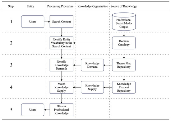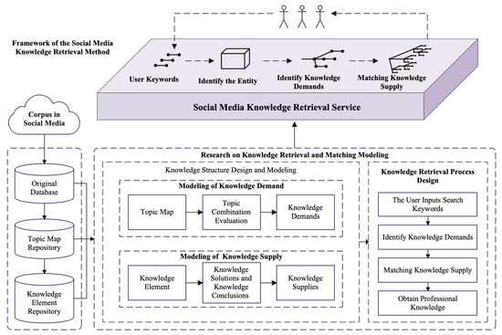As social media booms, more and more users are expressing their opinions and thoughts on various social media platforms. In this paper, social media specifically refers to professional social media, which is defined as an online content production platform used by internet users to share and exchange opinions, insights, experiences, and creative ideas related to a specific professional subject, containing a large text corpus with valuable information in the form of comments and articles published by users [1]. Users and enterprises also realized that the information needed to support their decision making is not isolated or fragmented information but rather is specified and interrelated knowledge [2,3]. However, professional social media text is characterized by a large volume, varying lengths, strong professional relevance, a high level of creativity, and the use of colloquial language. Users searching on social media typically focus on a specific topic [4]. Using full-text searching methods to acquire specific knowledge on a particular topic, users often need to engage in extensive search and reading activities [5,6]. Concurrently, knowledge is abundant and complex, making it challenging to organize within a unified structure and difficult to comprehend [7,8]. Users must manually perform classification, deduplication, evaluation, and summarization of the acquired information, processes that are both time-consuming and labor-intensive. Consequently, the cost of directly obtaining specialized knowledge from social media platforms is considerably significant for users and enterprise [9]. Therefore, this paper proposes a new knowledge retrieval method for users and enterprises to reduce search time and improve the accuracy and efficiency of knowledge acquisition from social media platforms.