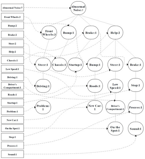 After obtaining the Knowledge Demands that match the keywords “Magotan” and “abnormal noise”, the corresponding Knowledge Supply needed to be matched for each Knowledge Demand. Firstly, related Knowledge Elements were matched for each Knowledge Demand using the method described in Section 2.4.1.