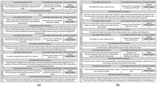 The traditional search function in social media can solely retrieve the original posts that include the keywords in their titles, without any refinement, categorization, or summarization of the search results. Users can only obtain the desired knowledge or information by reading the specific content of each post one by one. In contrast, the Knowledge Solutions and Knowledge Conclusions obtained through Knowledge Demands and Knowledge Supplies build a centralized and hierarchical knowledge content in the corresponding search results in Figure 9. Users can have an overview of the returned knowledge content. They can also explore specific details of the content they are interested in by following the hierarchical chain of Knowledge Demands, Knowledge Supplies, Knowledge Solutions, and Knowledge Elements. For example, in Figure 9, the user can obtain Knowledge Demands such as “vibration”, “bumps”, “brakes”, and “steering”, and then view the specific content in Knowledge Element 3 of Knowledge Solution 2 corresponding to “bumps”, obtaining information such as “abnormal noise”, “cold weather”, “starting”, and “front wheels” keywords in the Knowledge Element. Therefore, the knowledge retrieval method of this paper is more efficient in obtaining knowledge than the search function in the Autohome forum.