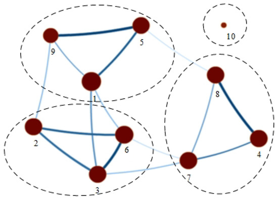 Each red dot in Figure 7 represents a Knowledge Element, and the number around each red dot is the Knowledge Element ID. The size of the red dot indicates the centrality of the Knowledge Element in the clustering result. The blue lines show the similarity between each Knowledge Element, and the thicker the blue line, the higher the similarity. In Figure 7, the 10 Knowledge Elements can be divided into four clusters, as shown by the dashed circles in Figure 7: 1, 5, and 9 form the first cluster; 2, 3, and 6 form the second cluster; 4, 7, and 8 form the third cluster; and 10 is a separate fourth cluster. The set of Knowledge Elements in each cluster is a Knowledge Solution.