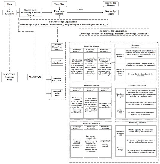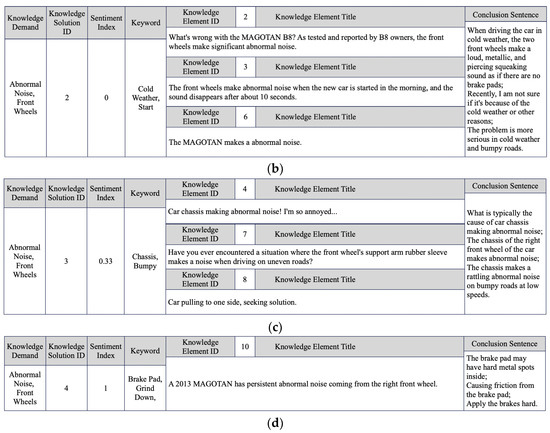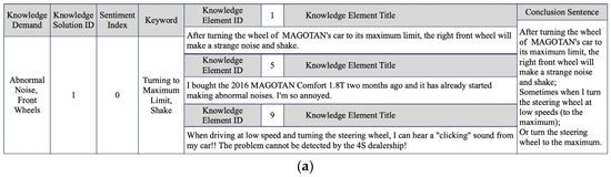 From the user’s perspective, all the results generated from the above processes were linked together. Figure 9 shows the output results of the entity recognition, knowledge matching, and acquisition processes in response to the user input “MAGOTAN” and “abnormal noise” search keywords. The top half of Figure 9 displays the name of each process and its corresponding knowledge organization structure, and the bottom half displays the intermediate results that the user can obtain. Figure 9 shows the Knowledge Supply corresponding to the Knowledge Demand of “abnormal noise, front wheel”, which displays three sets of Knowledge Solutions and their corresponding Knowledge Conclusions.