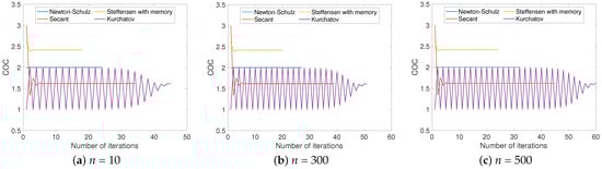 Table 1 shows the results obtained by approximating the inverses of nonsingular random matrices of sizes , and 500 using the Newton–Schulz, secant, Steffensen with memory, and Kurchatov-type methods. The number of iterations, residuals, and the COC value are shown. The results confirmed the theoretical order of convergence obtained from each method. Using all methods, the approximation of the inverse of A was obtained. In all cases, the Steffensen method with memory showed better results in terms of the number of iterations and the computational time. The graphs shown in Figure 2 represent the results presented in Table 1 for the cases of matrices of , and 500.
