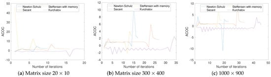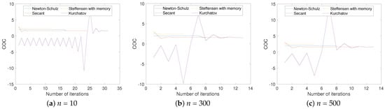 As a first example, we looked for the inverse random matrices of size , where , and 500. Since Newton–Schulz’s method needs one initial point, we took it as . The rest of the methods need two initial points, which we took as and .