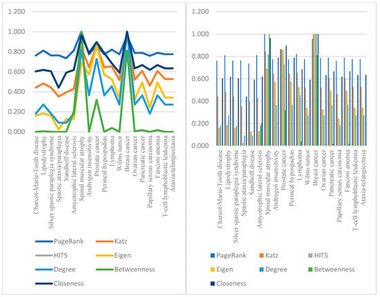 Spinal muscular atrophy has the maximum values for PageRank and betweenness centralities. It also noted that breast cancer has the highest values for Katz, HITS, eigenvector, and degree centralities. Thus, we can say the mentioned diseases are highly connected to other diseases. Thus, it is necessary to determine the appropriate formulation to find the most central node. The average values of all mentioned centralities are shown in the following Table 3.
