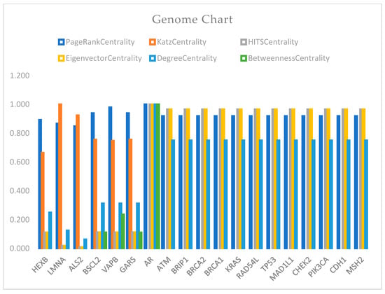 The genome network is not as complex as the HDN (see Figure 4, Figure 5 and Figure 6). We can see that the centralities from the bottom nodes (after node no. 7) of the network are higher and almost the same. It can also be seen from Figure 5 that the right part of node 7 (AR) is a clique. Every pair of nodes is connected. Thus, there is a high chance of spreading the disease if one is infected.