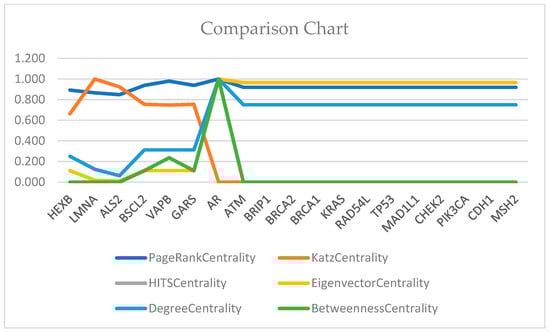 We consider PageRank, Katz, HITS, eigenvector, betweenness, and closeness centralities of the selected nodes in the HDN network (Table 1). The central values of the selected nodes are shown in Table 2. The comparison of the centralities of the HDN is shown in Figure 2 and Table 2.