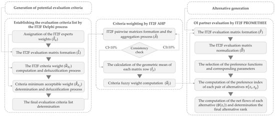The framework also provides a methodology for rational and reliable criteria weighting based on the vague linguistic evaluations of multiple experts by applying the IT2F AHP approach. The strength of this method is based on the ability to express preferences using linguistic statements, which is more similar to the human way of thinking, the concept of systematic pairwise criteria comparison, and a mathematically simple synthesis of the obtained results for deriving criteria weights. Additionally, the framework incorporates the methodology for multi-criteria evaluation and ranking of alternative OI partners based on the IT2F PROMETHEE approach, which is suitable for solving complex decision-making problems that require a range of human perceptions and judgments, especially when there are significant differences in participants’ perceptions of the decision-making process. Moreover, the criteria properties are treated in a proper way by involving different types of preference functions as well as the associated parameters for each criterion.