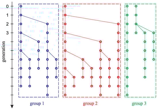 In [], a model for the accumulation of negative mutations in a population of mice is presented based on experimental data published in [] on the estimation of the mutation rate of four groups of mice: three groups of laboratory-type mice and one group of wild-type mice. The groups differed in the original pair of mice that gave rise to each group. Unlike wild-type mice, the corrective activity of polymerase, an enzyme that promotes precise DNA synthesis, was disabled in laboratory mice [,,]. In this sense, all laboratory mice were considered mutants. In each of the three groups of laboratory mice, ones with visible (phenotypic) differences appeared due to the accumulation of mutations, giving rise to a new mutant line. (A mutant line is a group of individuals that originated from one pair of mice and do not have visible differences). Figure 1 schematically shows the process by which new mutant lines emerge in each group of mice from generation to generation. Each isolated group of mice is marked with a separate color. Each circle represents a group of phenotypically identical individuals. Circles at the same horizontal level correspond to the same generation in the mouse population. The lines connecting the circles represent the transition from the generation of parents to the generation of children. Each mutant line in the scheme is traced as a set of circles connected by vertical lines. If a certain group of parents gave birth to mice with phenotypic differences, then several straight lines would depart from the corresponding circle. Each line branching off to the side means a transition from parents to descendants phenotypically different from the latter. Thus, we denote the emergence of a new mutant line, individuals of which can reproduce their own kind. The number of phenotypically distinct groups in each generation can be determined by the number of circles that are at the same horizontal level.