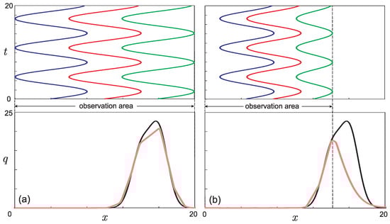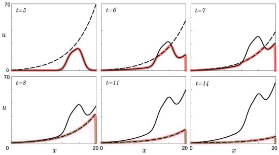 Here we denoted the x-variable interval as . Thus, the dependence in the first equation can be considered known. The right side of the first equation is a quadratic polynomial whose roots are the functions and . According to the results of [,], the solution of the differential equation attracts the smallest of these functions. Figure 2 illustrates the direct problem solution as a function of time. Due to the inequality , and the choice of the initial condition , taking into account the fact that for , the value of the function corresponds to the stable equilibrium of the first equation of system (1), so it does not change with time until . For and small values of such that for every the inequality holds, the function attracts the values of the function (solid black line in Figure 2). As t grows, the inequality becomes valid, and the solution attracts the function (dashed black line in Figure 2). Since for sufficiently large t, the function takes values close to , then the values of become close to zero over time, and the function tends to this value.