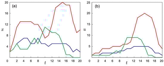 The graphs obtained from experimental results []: (a) dynamics of the number of individuals x in each of the three mutant groups of mice over generations (t); and (b) dynamics in the phenotypic differences (adapted from []) (u) for the three mutant groups of mice over generations t. Different mutant groups are marked with different colors.