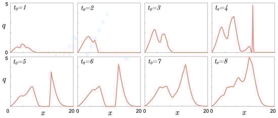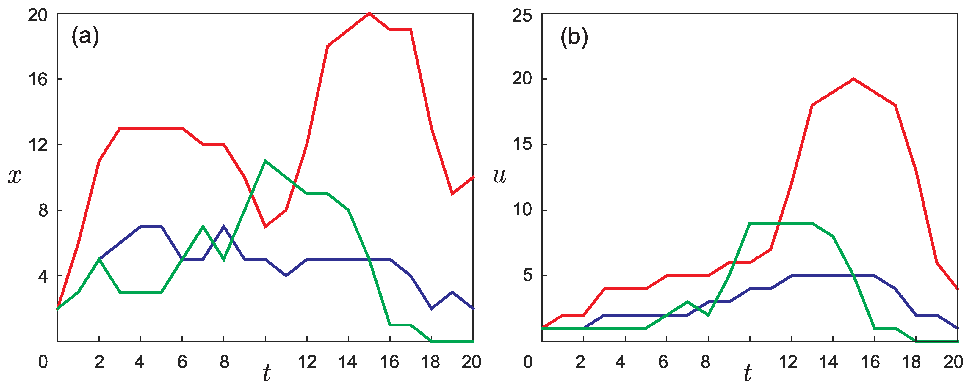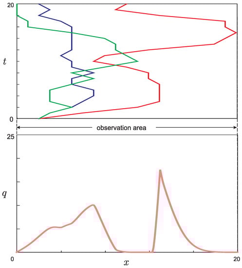For the specified set of parameters, we have simulated the functions , , according to the algorithm described in Section 3.1.