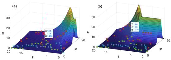 Figure 7. Graph of the direct problem solution, . The points on the graph correspond to the known coordinates of nodes on the phase curves (Table 1, blue points), (Table 2, red points), (Table 3, green points). (a) . (b) . The coordinates in squares show the difference in the values of the function at the reference points for different . - The way to improve the retrieval quality is to increase the number of experimental curves in the coverage area.