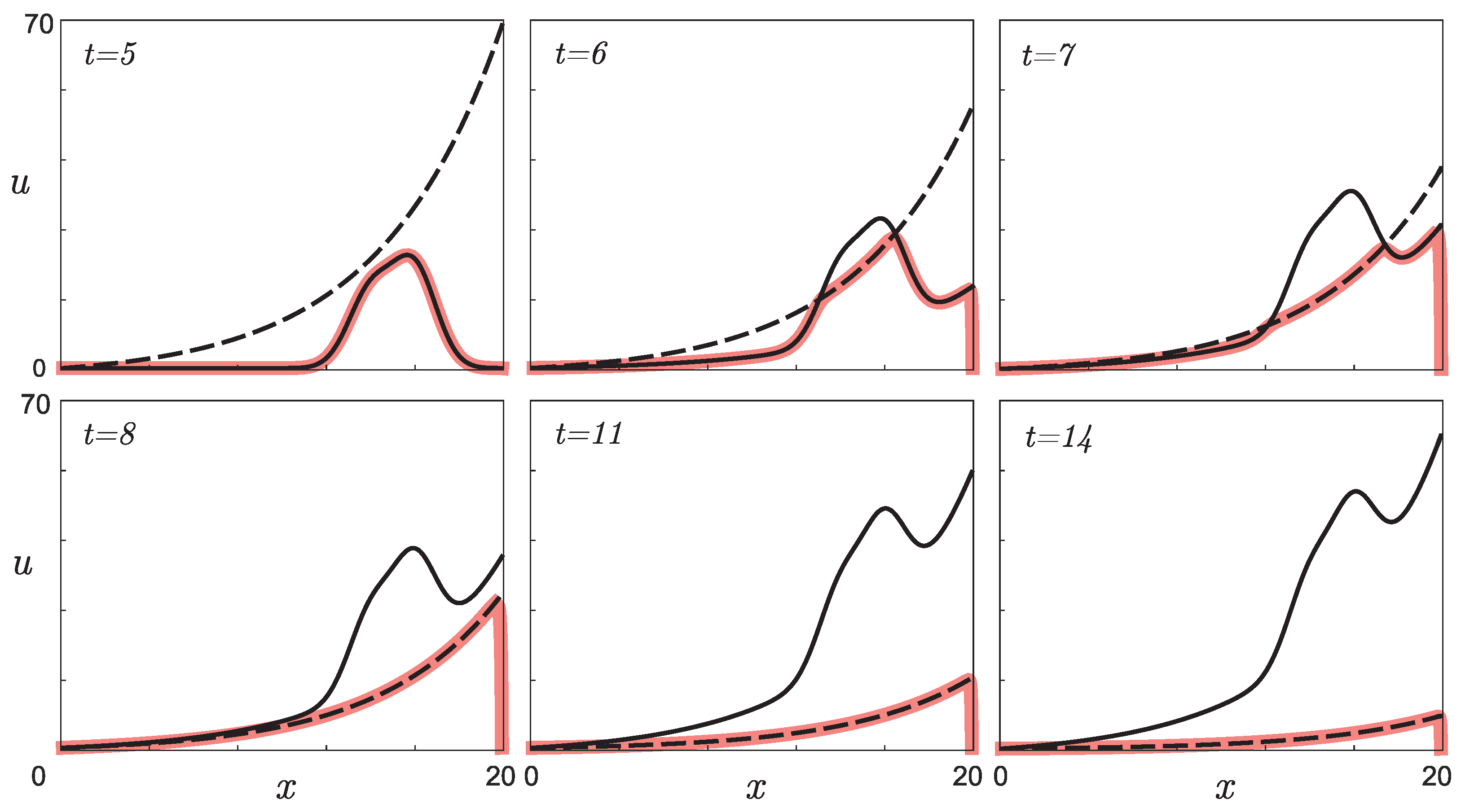 Illustration of the direct problem solution change over time: the numerical solution (thick red line), the function (solid black line), and the function (dashed black line).