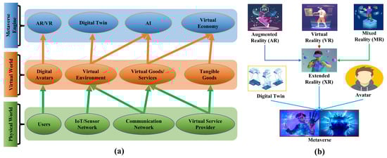 (a) The overview of the metaverse framework with different parts (such as the physical world, virtual world, and metaverse engine); (b) conceptualization of the metaverse summary.