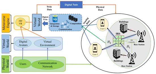 The key features of an IRS can be implemented with a modest investment in hardware and minimal energy; this provides high-gain beamforming and serves as a backup link when a direct link is not available []. The 6G wireless networks offer an incredibly high data rate, great dependability, extensive worldwide coverage, minimal latency, high energy efficiency, and high reliability []. We demand more sophisticated network hardware as well as fresh strategies for effective wireless communication in order to fulfill these objectives. According to recent academic publications, IRSs and terahertz communication are the key concepts for 6G [,]. Thus, to achieve the goal of 6G, it is preferred to employ the IRS. Therefore, an IRS-assisted system can significantly impact high throughput and achievable rates in metaverse research for the next generation. In addition to wireless communication systems in metaverse scenarios, the implementation of an IRS-aided communication system may be a potential solution for achieving low latency and higher throughput systems. In [], the authors proposed the unique utility-oriented communications (UOC) concept and discussed its significance for 6G wireless technology. In addition to incorporating newly developed human-centric and task-oriented communications principles, UOC embraces established communication paradigms. The authors used the vehicular metaverse as a case study of UOC to examine semantic communications and semantic information transfer for IRS-aided systems. Moreover, IRS-assisted wireless communication systems based on deep machine learning [,] could be a possible applicable emerging field in metaverse scenarios.