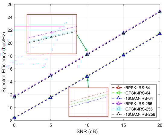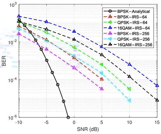 Figure 4 depicts the BER performance of the proposed system in terms of different SNR ranges. From Figure 4, the results show that the BPSK modulation with 256 IRS elements achieves the highest performance compared to the different simulation modulations, such as QPSK, 16QAM, and IRS elements. In addition, the simulation results show that the BER is enhanced according to the increase in the IRS element. In addition, we compared the simulation results with the analytical case; it can be seen that the simulation results follow the same trend as the analytical result.