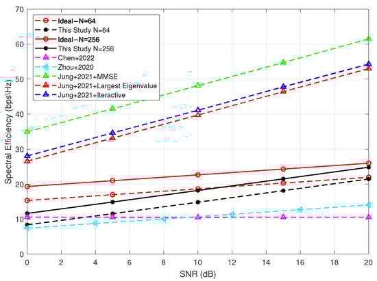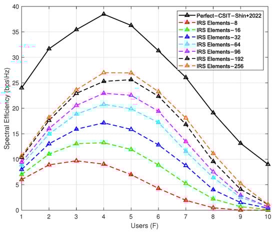 The SE performance, according to user count, is shown in Figure 7. It has been demonstrated that the SE is increased according to the number of IRS elements. In particular, the IRS element number 256 achieves the most significant SE with UE 4 and 5, respectively. However, because of the low-rank issue, performance suffers when there are more than 6 users. Generally speaking, it is anticipated that the IRS will be stationed near to the BS. Additionally, the LOS route is included in the Rician fading channel between the BS and the IRS. Because of the increased spatial correlation of channels in this system setting, IRS-aided multi-user systems struggle with a shortage of rank. Low-rank issues are also brought on by channel sparsity of the short mmWave wavelength. Figure 7 demonstrates that the lack of rank causes the performance curve to appear as the user grows. As a result, numerous IRSs are employed in systems with more users, or a robust scattering environment is required. Furthermore, Figure 7 indicates that in the proposed systems, the SE performs almost identically when there are 10 users. The perfect channel state information at the transmitter (CSIT) [] curve is shown in a black line. A similar trend is compared to the other results.