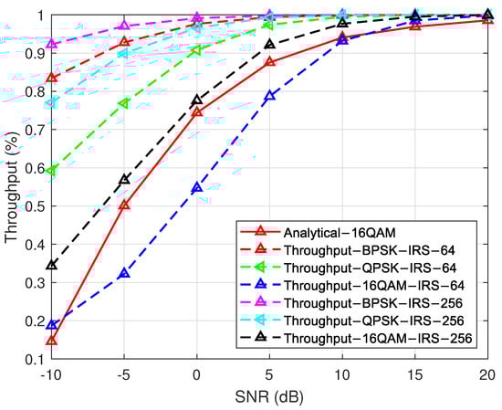 Figure 8 shows the performance of the actual transmitted and processed data throughout the network with the different SNR values. For this analysis, the three different modulation techniques—BPSK, QPSK, and 16QAM—are considered. Also, the analytical results are compared with the modulations; it can be seen that the simulation results follow a similar trend to the analytical results. In addition, the performance is measured by changing IRS element numbers 64 and 256, respectively. It can be seen from Figure 8 that the throughput of the system is gradually increased with the IRS elements and the change in modulation orders. After an SNR of 15 dB, most of the modulation techniques reach the highest throughput values. With the IRS element number of 256 as well as BPSK modulation, the throughput is maximized. In contrast, the lowest throughput is achieved with an IRS element number of 64 and a QAM modulation of 16.