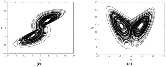 where is the quadrature-axis current, is the direct-axis current, is the motor angular frequency, and and are the system parameters. When and , the PMSM system has the chaotic characteristics. The chaotic phenomena are illustrated in Figure 1 with the initial states set as , , and . Let . It is easy to find that the PMSM system has three equilibrium points , , and .