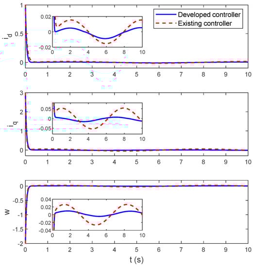 Permanent magnet synchronous motors (PMSMs) play a crucial role in various industrial applications. It is well-known that PMSMs can exhibit chaotic behavior when their parameters fall within a certain range, which may lead to system instability. Ensuring the safe operation of PMSMs requires the significant consideration of chaotic stabilization [1,2,3]. Chaotic systems exhibit irregular and unpredictable dynamic behavior, which is highly insensitive to initial conditions. To control or manipulate chaotic systems, two main approaches are commonly used. The first approach involves using feedback control techniques to regulate the system states from chaos to order. The second approach involves estimating the system states using filtering techniques and then utilizing these estimates for regulation. The chaotic stabilization of PMSMs falls under the first approach, where appropriate feedback control is added to achieve the desired behavior. Various methods have been extensively investigated for chaotic control, including adaptive control [4,5,6], backstepping control [7,8,9,10,11,12,13,14], sliding mode control [15,16,17,18,19,20,21,22], iterative learning control [23], and intelligent control [24,25,26,27,28,29,30,31,32,33,34,35].