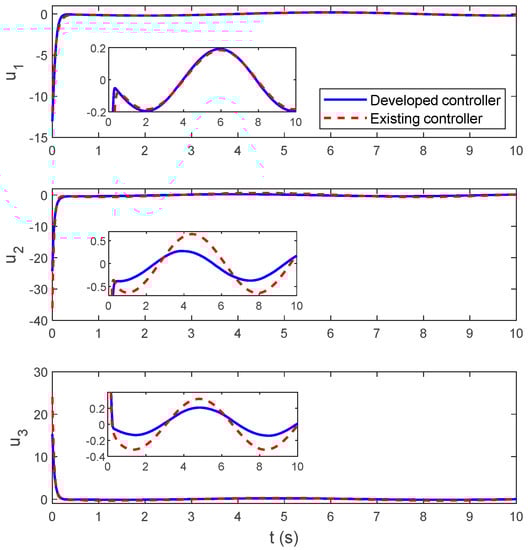 The simulation results of Scenario 1 are given in Figure 2, Figure 3 and Figure 4. Specifically, Figure 2 shows the time history of the system states. It is desirable that both the developed and existing controllers can fulfill the chaotic stabilization successfully. Quantitatively, the steady-state state errors , , and under the developed controller are within the ranges of , , and , and under the existing controller are within the ranges of , , and . The existing controller can attain the much larger steady-state state errors than the developed controller. This implies that the stabilization performance of the developed controller is better than that of the existing controller in terms of higher control accuracy. The time history of the control inputs is presented in Figure 3. The control inputs under the existing controller even have a larger magnitude than those under the developed controller. This means that comparisons are quite fair or at least not partial to the developed controller. Figure 4 gives the time history of the adaptive parameters. These adaptive parameters are changing smoothly with time. Owing to the utilization of the parametric adaptive mechanism, the developed controller is not only insensitive to unknown parameters but also robust against perturbations. By contrast, the disturbance rejection property of the existing linear feedback controller is really poor.