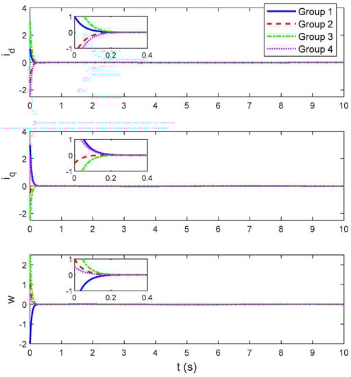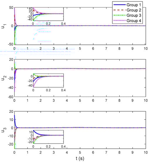In Scenario 2, the tests with different initial system states are provided to examine the fixed-time stability capability of the developed controller. Three groups of initial system states are considered. In Group 1, the initial system states are chosen as , , and . In Group 2, the initial system states are chosen as , , and . In Group 3, the initial system states are chosen as , , and . In Group 4, the initial system states are chosen as , , and . The perturbations and parameters of the developed controller (7) are chosen in the same way as those in Scenario 1.