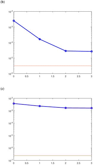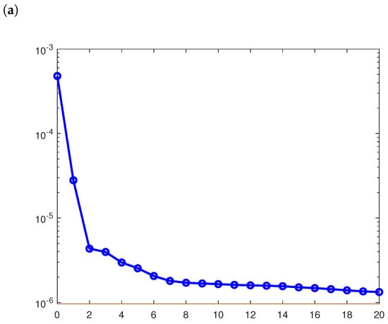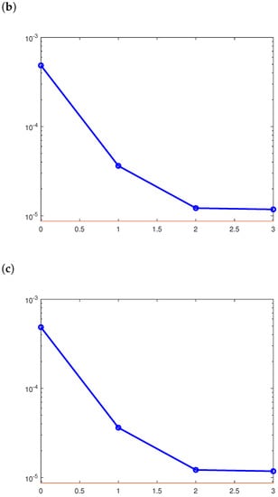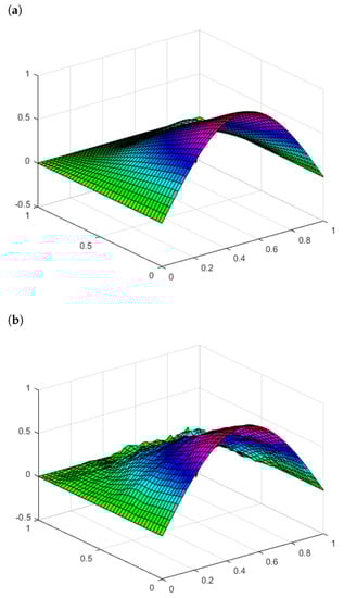 For this example, the number of the final iterations of CGM is for the noise levels , and 5 (Figure 4). Errors (47) and (48), associated with and , have been found for , and . Additionally, , and