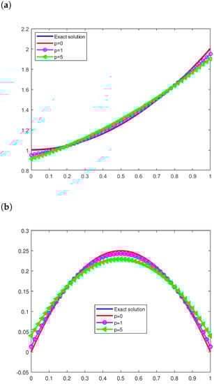 Figure 2 illustrates the numerical reconstruction of the coefficient b and the initial condition with the number of final iterations given in Figure 1 with different values for the noise levels, . From Figure 1, we can notice that the exact and the numerical solutions are almost equal; that is, the proposed algorithm to determine the two coefficients converges to the required solutions.