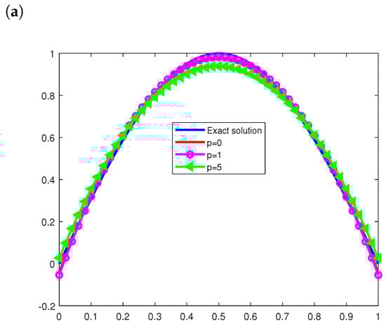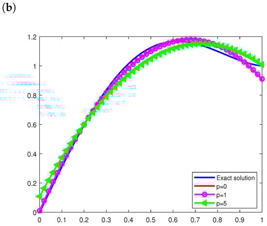 Similarly, for Example 1, using the discrepancy in (46), the stopping iterations are, for the noise levels , and 5. The errors (47) and (48) associated with and have been found for and with noise level and 5, respectively, Under these stopping iterations, Figure 3 illustrates the exact and numerical solutions for Example 2 for different values of the noise levels (, and 5).