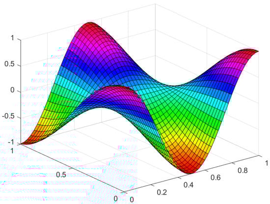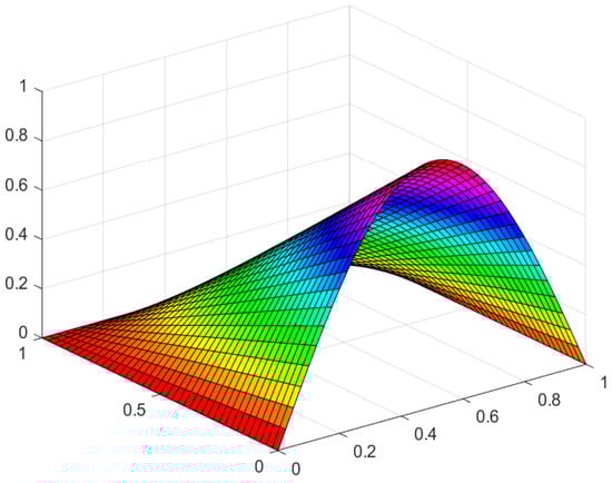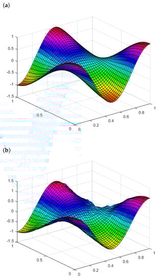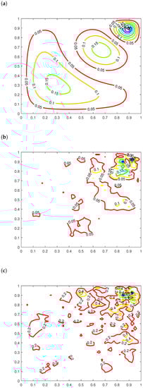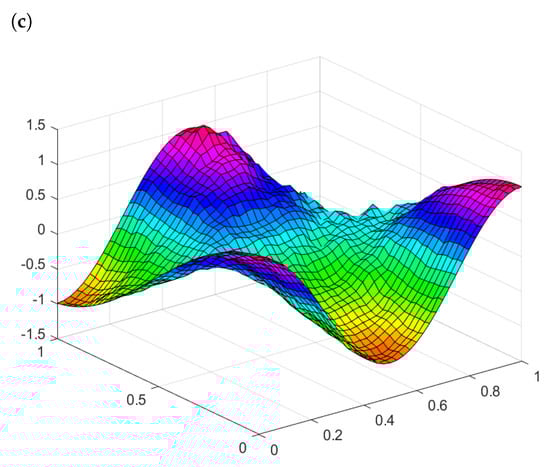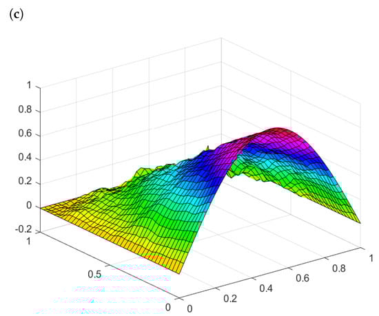 For two-dimensional problems, as given in Example 3, Figure 4a represents the graph of the functional without a noise level (0 percent) and with the iteration number . Figure 4b represents the graph of the functional J with a noise level (1 percent) and with the number of iterations Figure 4c represents the graph of the functional J with a noise level (5 percent) and with the number of iterations Figure 5 represents the exact solution to the recovered reaction coefficient. Figure 9a, Figure 9b, and Figure 9c represent the graphs of the reaction coefficient b without a noise level (0 percent) and with noise levels (1 and 5 percent), respectively. Figure 7a, Figure 7b, and Figure 7c represent the graphs of the absolute error between the exact and numerical reaction coefficient b without a noise level (0 percent) and with noise levels (1 and 5 percent), respectively. Figure 6 gives the exact solution to the initial condition. Figure 10a, Figure 10b, and Figure 10c represent the graph of the reaction coefficient b without a noise level (0 percent) and with noise levels (1 and 5 percent), respectively. Figure 8a, Figure 8b, and Figure 8c represent the graphs of the absolute error between the exact and numerical reaction coefficient b without a noise level (0 percent) and with noise levels (1 and 5 percent), respectively.