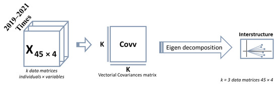 The first technique applied in this study is X-STATIS [36], which is used when data are structured in a three-way format. In the case of our data, we characterize the flags (first way, countries that make up the study) based on the results of the inspection with the variables that evaluate the characteristics of the ship (second way, variables of age, dimensions of the ship, number of deficiencies, and type of inspection) over time (third way, study years 2019–2021). This technique belongs to the STATIS method family [37,38], which has the objective of extracting stable information from k data tables. This method divides its process into three stages: interstructure, compromise, and intrastructure. Next, we will describe the first two stages (the third is not the subject of this study) for our data table with dimensions of 45 flags × 4 variables × 3 years.
