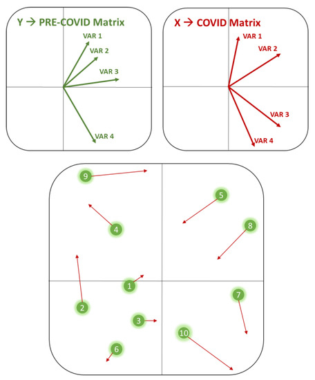 This means that, for individuals with short vectors, the variables of matrix Y adequately explain the structure found in matrix X and vice versa. Furthermore, to provide this with context, countries with short vectors would have similar characteristics in both time periods (e.g., Figure 5, individuals 1, 3, and 6); in contrast, countries with large vectors will have changes between the two time periods. It is also possible to characterise each country based on its position on the plane by observing the quadrants; for example, in Figure 5, the observation ‘10’ prioritises the variables ‘VAR 4’ of the Pre-COVID matrix and ‘VAR 3 and 4’ of the COVID matrix; and we can also observe that there is a relationship between these variables.