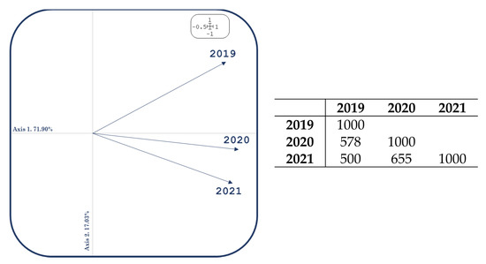 The next step is the construction of the compromise matrix, which constitutes a global summary of all of the tables, and therefore summarises all of the information for the study period, and whose decomposition into singular values and vectors provides a Euclidean image in a low dimensional space. The representation on the first two factorial axes contains approximately 74% of the information, and every year has a similar weighting factor within the compromise matrix, as we can see in Table 5, where the column ‘Weights’ indicates the weight that each factor acquires from each matrix in the construction of the compromise (greater weight, greater contribution); and the column ‘Cos2’ shows us the cosines squared, which indicate the quality of representation that each matrix has in the compromise (values close to 1, best representation in the compromise), where we observe a good representation of these matrices, which are somewhat higher for the COVID period.