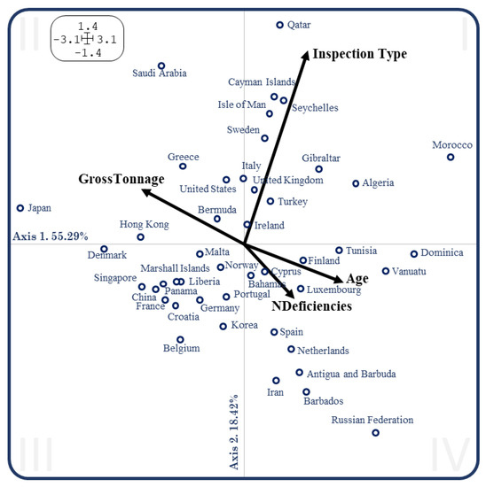 The figure shows how the different countries are distributed throughout the plane, showing high variability, which facilitates the visualisation of the differences between countries of registry. The countries are situated based on the structure of the variables, which are fairly clear, showing a strong relationship between ship’s ‘Age’ and the number of deficiencies ‘NDeficiencies’. This means that the older the vessel, the more deficiencies are found. This is interesting because it describes a sub-standard vessel, a small, ageing ship, because ‘Age’ is also inversely related to ‘GrossTonnage’. The structure here, however, changes with respect to the ‘Mathematics’ article mentioned previously [31], in that the variable ‘Inspection Type’ appears to be independent to the rest of the variables, which is likely to be a consequence of the pandemic, as the ‘more detailed’ inspection was rarely conducted. Therefore, countries found in the lower half of the plane (Belgium, Croatia, France, China, Singapore, …) underwent more inspections of the ‘initial’ type, and those in the upper half of the plane underwent more ‘expanded’ inspections (Qatar, Saudi Arabia, Cayman Islands, Seychelles, Isle of Man, …).