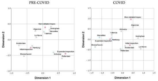 In this section, we apply a correspondence analysis to tables, to see the type of inspections that were conducted and their frequencies, along with their representation on a factorial plane. We analyse if there were differences based on period, Pre-COVID and COVID, and if there were any changes in the type of inspections conducted in each port. The results of this analysis show there is statistical significance (p-values = 0.000…). This significance can be clearly seen in the change of inspection type, wherein in the Pre-COVID period, the type ‘more detailed inspection’ was prioritised, accounting for 45% of the inspections, whereas in the COVID period, they accounted for just 13% (see Table 6 and Table 7). This information is clearly reflected in the ports in Figure 8, where we show its depiction on a factorial plane. All of the ports concentrate on less exhaustive inspections and the ‘more detailed inspections’ play a secondary role, shown to be further apart in the COVID period graph. This is one of the main consequences of the pandemic.