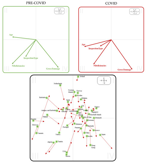 On the contrary, those countries that present long vectors will indicate a change and will correspond to the countries most affected by the different restrictions and regulations that each country imposed during the COVID-19 pandemic. If we look at Figure 9, referring to the position of the variables, most of them are located in the third quadrant (lower left semi-plane), therefore, those countries located in this area of the plane will correspond to older vessels with a more detailed type of inspection and a greater number of deficiencies. Thus, in Figure 9b, the observed movements are horizontal, therefore countries such as the UK, Luxembourg, the Isle of Man, and Greece present a shift towards the left-hand semiplane, which translates to their ships having an increased number of deficiencies, and the inspections of their ships being slightly stricter; on the other hand, Russia, Finland, and Barbados ships have shown a slight improvement in their evolution.