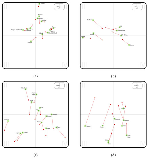 In Figure 9c, countries such as Spain, Panama, Japan, Morocco, and Algeria show vertical movements towards the lower semiplane. The countries in this figure are the most negatively affected by the pandemic in comparison to the others in this study, where their ship inspections have been affected by older ships with a higher number of deficiencies.