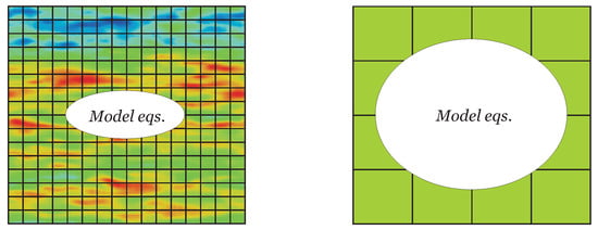 The different L settings applied in the RANS (LES) in conjunction with coarse (fine) computational grids have remarkable consequences, which are illustrated in Figure 3: the LES (RANS) concept is shown on the LHS (RHS). Due to the relatively large modeled viscosity, turbulent velocity fluctuations are not resolved in the RANS on coarse grids. All the turbulent motion is modeled, and we talk about modeled motion. In contrast, due to the relatively small modeled viscosity, turbulent velocity fluctuations are resolved in the LES on sufficiently fine grids. This means the LES involves two simulation ingredients: modeled motion represented by the equations applied and resolved motion represented by the resolved velocity fluctuations. Correspondingly, the RANS and LES simulation concepts show remarkable differences in simulations. The RANS methods are computationally very efficient because they run in steady mode, and coarse grids can be applied. However, in regard to separated turbulent flows (see the illustration in Figure 1), which are usually seen in applications involving solid boundaries, the RANS were found to provide unreliable turbulent flow predictions because of their inability to properly reflect instantaneous turbulence. There is a substantial amount of work aiming at the improvement of RANS predictions for separated flow by the involvement of machine learning methods. However, so far there is no convincing demonstration that such methods can overcome the typical RANS issues, see ref. [19]. The LES usually provides much more reliable predictions because of the ability to involve instantaneous flow. However, the need to apply a sufficiently fine computational grid makes the LES very often unaffordable for simulations of complex high- flows seen in reality: see Section 2.3.