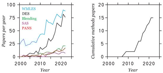The only promising approach to deal with this problem is an appropriate hybridization of the RANS and LES [9,18,20,21]. A variety of approaches for combining the RANS and LES equations have been suggested so far, for example, the wall-modeled LES (WM-LES) [22,23,24,25,26], the detached eddy simulation (DES) applied in conjunction with several equations [21,27,28,29,30,31,32], the Reynolds-stress-constrained LES (RSC-LES) [33], unified RANS-LES (UNI-LES) [34,35,36,37,38,39,40,41,42,43,44,45,46,47], the partially averaged Navier–Stokes (PANS) [48], the partially integrated transport modeling (PITM) [49,50], and the scale adaptive simulation (SAS) methods [21,51,52]. Figure 4 illustrates the use of hybrid RANS-LES methods. The data shown on the LHS were obtained by searching in ScienceDirect for journal papers and books that referred to the mentioned phrase in the title, abstract, or keywords. More specifically, the record of blending methods was obtained by searching for “blending turbulence model”. A corresponding search for unsteady RANS (URANS) (not shown) provided a trend almost equivalent to the DES trend. The plot on the RHS of Figure 4 refers to papers that addressed typical problems of popular CFD methods: “log-layer mismatch”, “grid-induced separation”, or “hybrid gray area”. Interesting observations related to Figure 4 are as follows. First, there is a large variety of hybrid RANS-LES methods, but only a few methods are regularly applied, first of all, the WMLES and DES methods and then three other methods. Both the WMLES and DES are known to suffer from significant shortcomings. Second, the cumulative number of papers that addressed modeling issues shows that there is a very limited number of attempts (a total of 15 papers according to this search, which may give only a partial impression) to address the typical modeling issues of popular hybrid RANS-LES methods. Correspondingly, the predominant opinion of the community in this regard is “There exist two kinds of LES-RANS hybrid methodology: one is WMLES and the other being detached-eddy simulation (DES)” [53].