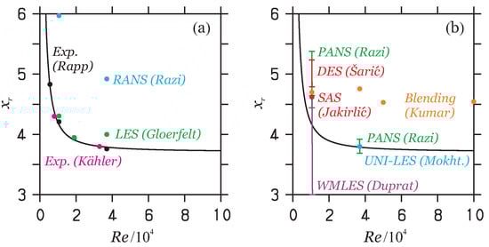 However, the concept of the WMLES faces issues. An adequate resolution of the boundary layer thickness (which makes the WMLES orders of magnitude more expensive than the original DES [25]) as expected is not feasible under many conditions, e.g., in thin laminar boundary layers. The off-wall location, where the LES is coupled to the wall model, needs to be prescribed as a fraction of the local boundary layer thickness, but the boundary layer thickness is unknown a priori for complex geometries [25,26]. Different computational mesh distributions can significantly affect the WMLES results for the same number of grid points [55]. An illustration of the uncertainty of the WMLES predictions in comparison to experiments, the RANS, LES, and other hybrid RANS-LES is given in Figure 5 regarding periodic hill flows: the corresponding reattachment point (see Figure 1, the point at about ) predictions obtained by different methods are shown for a range of . We see large prediction uncertainties depending on the simulation settings.