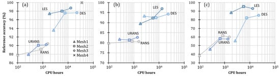 RANS, LES, DES, and URANS investigations of a high-speed train underbody flow using different grids to determine the solution accuracy versus computational cost: (a) underbody flow velocity; (b) drag; (c) lift. The reference accuracy is the accuracy relative to the LES data of Mesh4. Reprinted with permission from [72]. Copyright 2020 AIP Publishing.